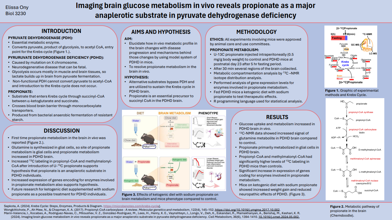 Summarized an academic article regarding the metabolic role of propionate in pyruvate dehydrogenase deficiency in the form of a poster presentation. Reviewed literature regarding the metabolism of propionate to better understand the topic before creating the poster. The review was done as an assignment for the BIOL 3230 Course, Biochemistry.